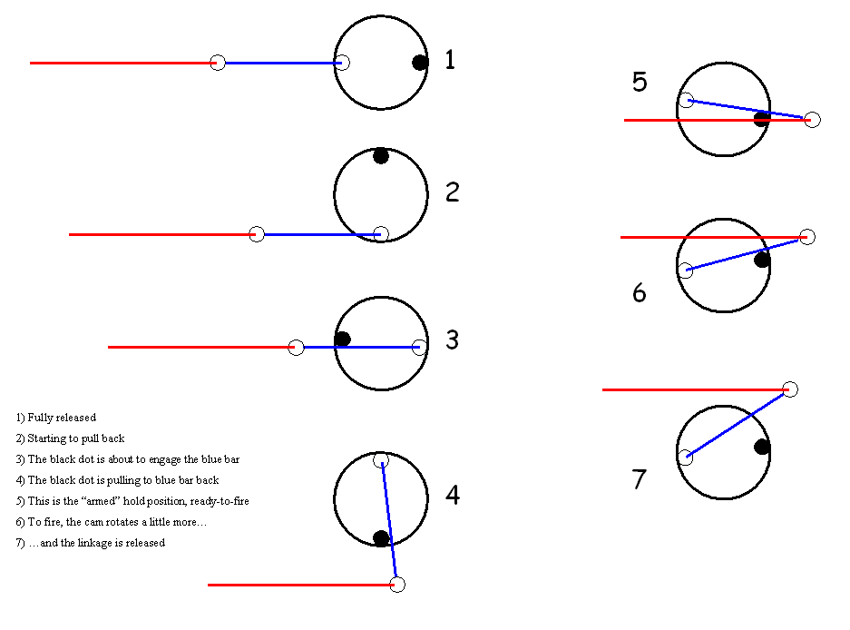 This works similarly to a train wheel, where a wheel rotates and at a certain point, it will engage a linkage, priming it.