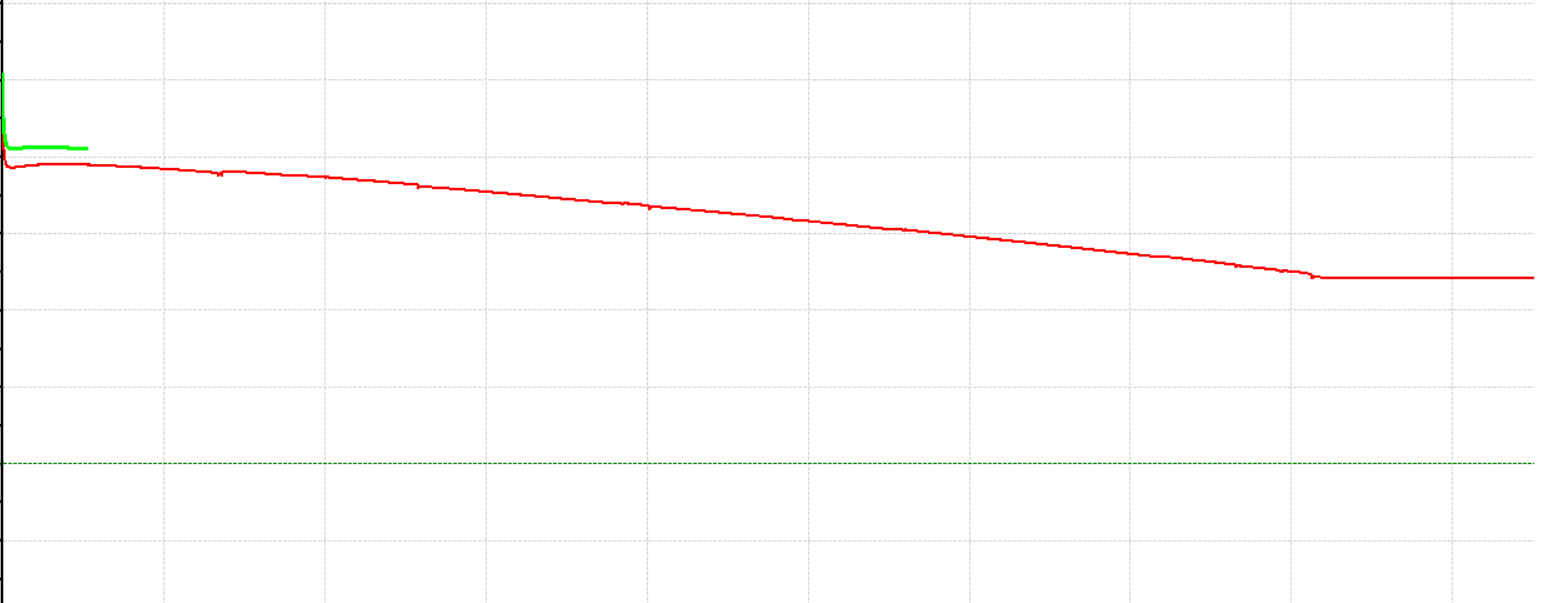 as we can see on the graph the solid green wire has reached the cuttof voltage so the test is finished but the solid red wire did not rech the green light because 3 hours was not enough so that is a failed test.