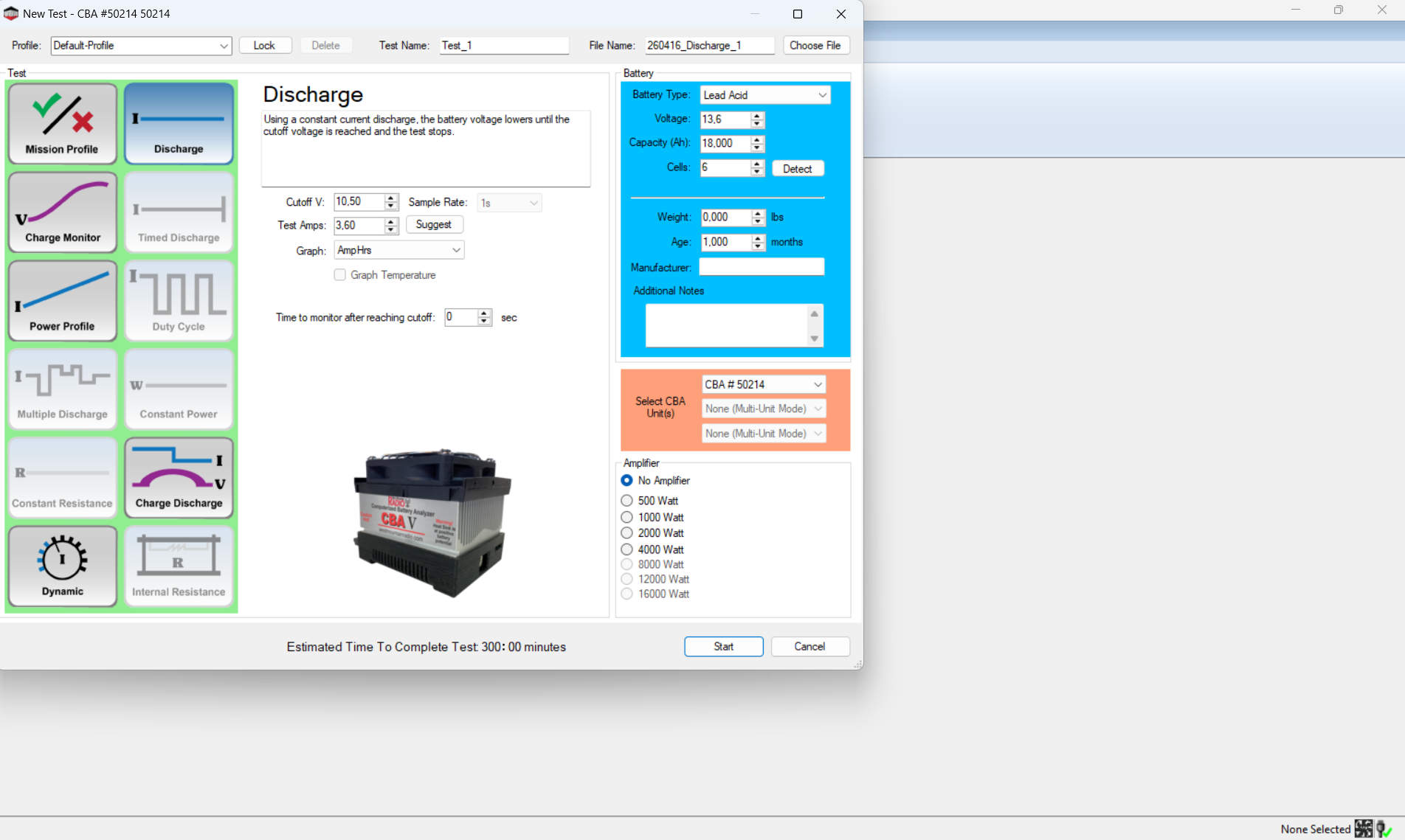 Now once you pluged in the battery to the CBA and the CBA to the pc on the bottom righ corner it will say none selected then a fan and next a usb with a ✅and now you can click new test and you will be directed to the thing in the top left for this test we will be doing a discharge, please remember that you must change the battery type do not run just with lead acid chek on your battery lables if you are not shure about the battery dont just gamble it get someone to help you