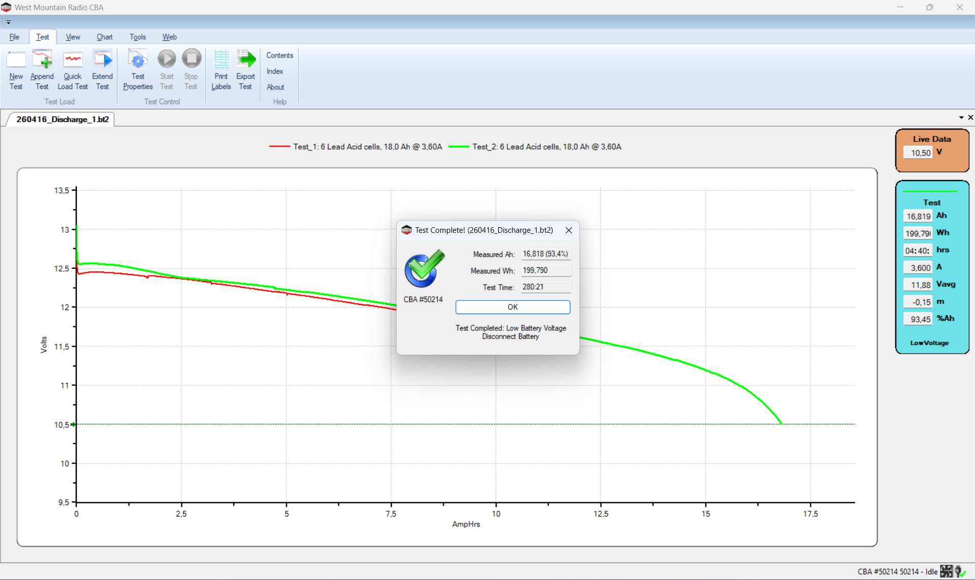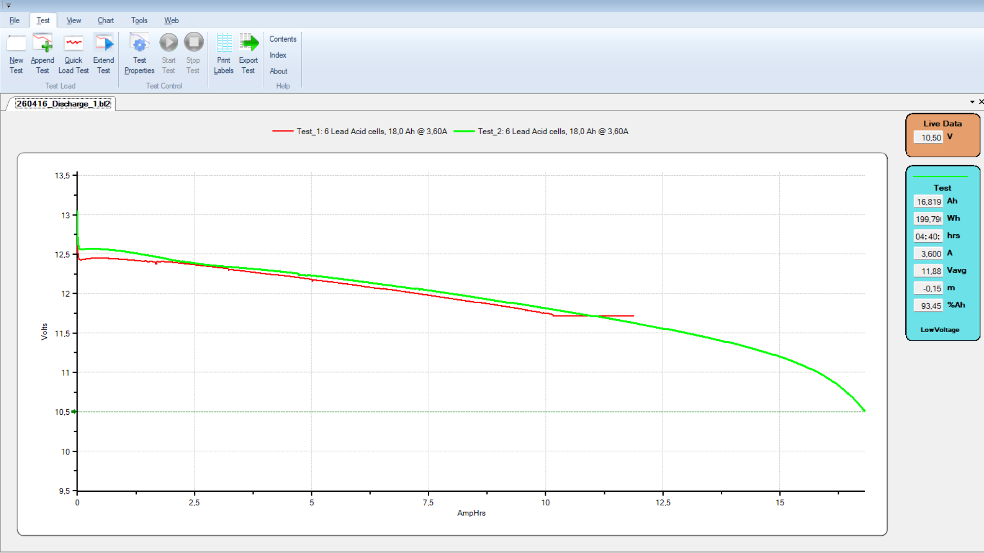 when the test is finished you will see that the line has reached the cutoff or 10.5 volts in my case wich is the green dotted line with an arrow on your cutoff voltage at 10.5V