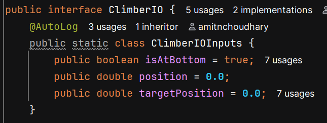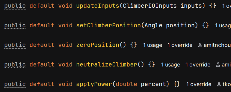 The updateInputs method will be used to log the inputs. Because this is an interface (outside of the ClimberIOInputs from earlier), none of these methods should have any code in them. Each method should have the void return type.