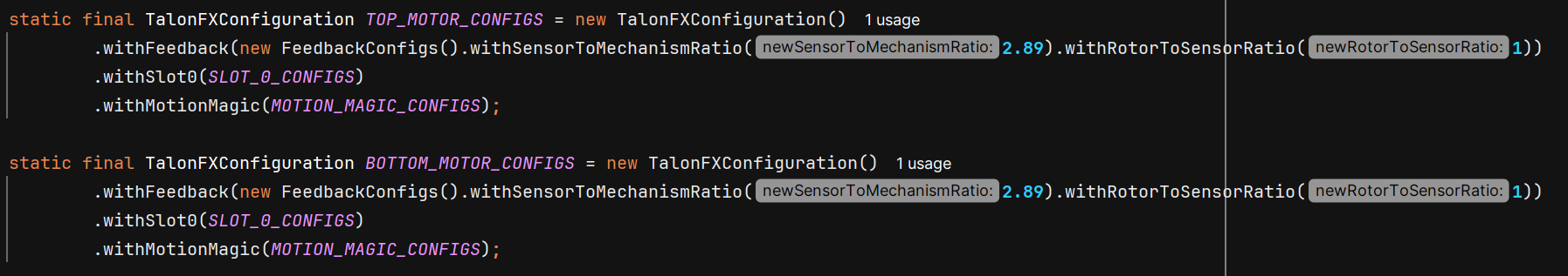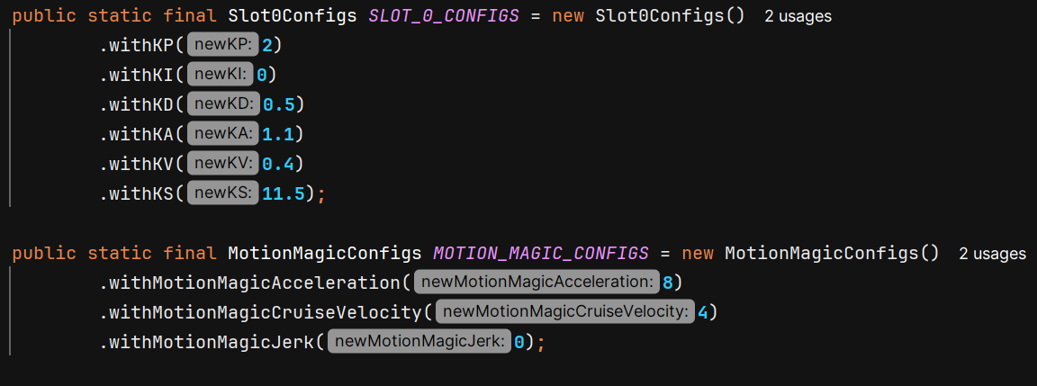 This file lists out all the configurations for the motors and sensors in the subsystem. It includes tuning constants, motor and sensor IDs, motor configs, and any motion magic requests you might need.