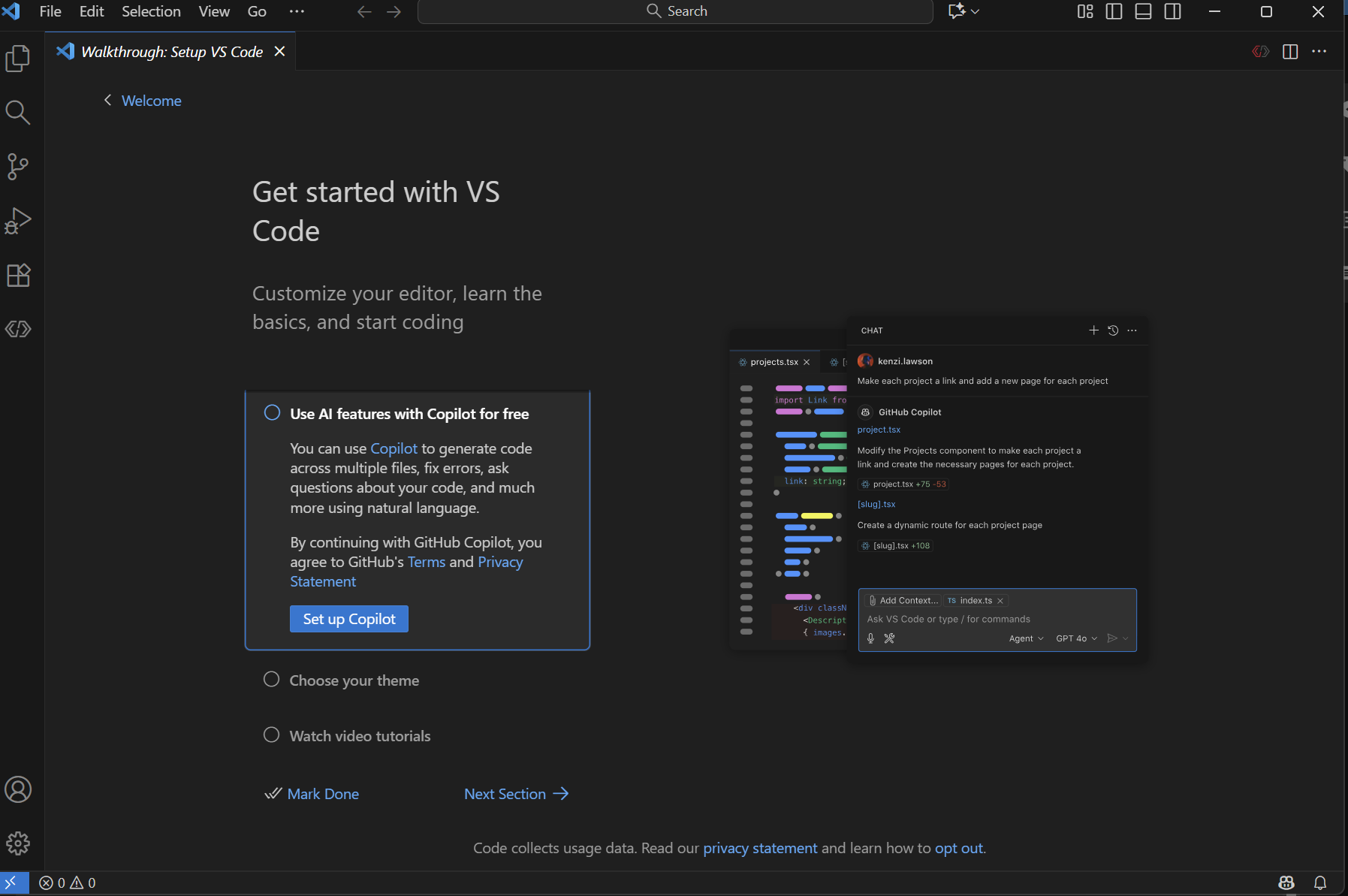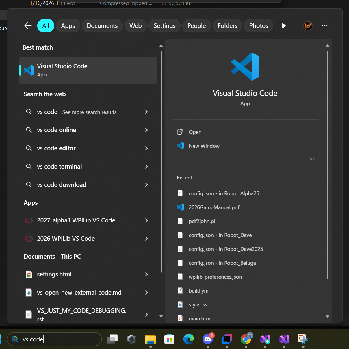 After it tells you that you are finished and you click on the Finish button, open the Start Menu (or its equivalent on Mac) and search up VS Code.